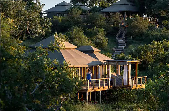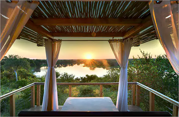 Simbavati Hilltop Lodge offers panaramic bush views towards the Drakensberg mountains, a circular bar and convivial fire-pit, all with stunning birds-eye views and spacious private decks with a Sala pavilion with daybed for each suite.
